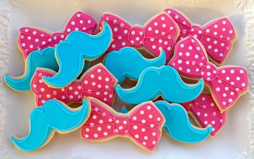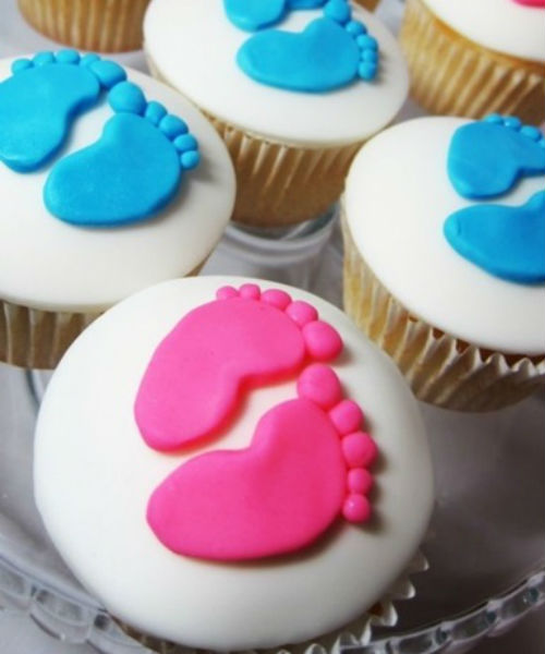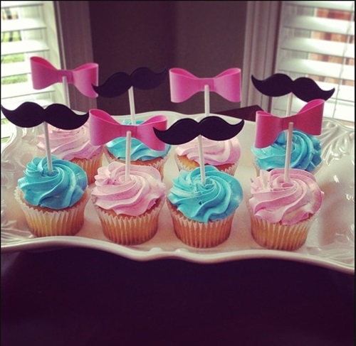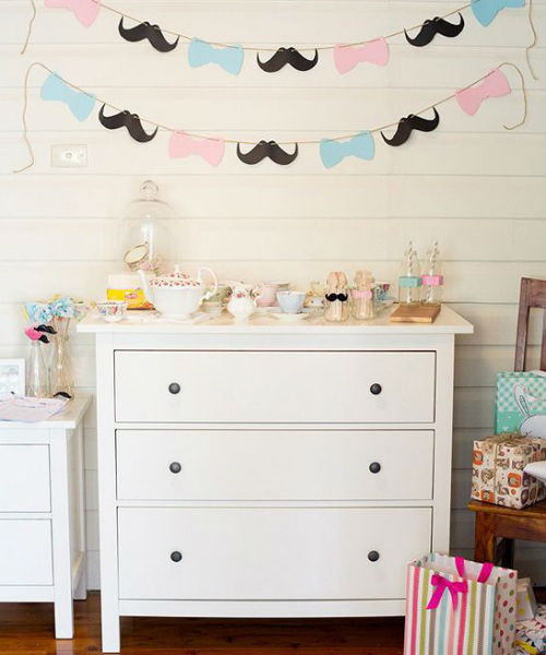 Comidinhas: biscoitos (que podem ter o formato de laços e bigodes!), cupcakes (com tags divertidas ou com pezinhos coloridos), sucos… Tudo muito gostoso e delicado! Veja nosso post especial sobre docinhos para chá de bebê aqui.