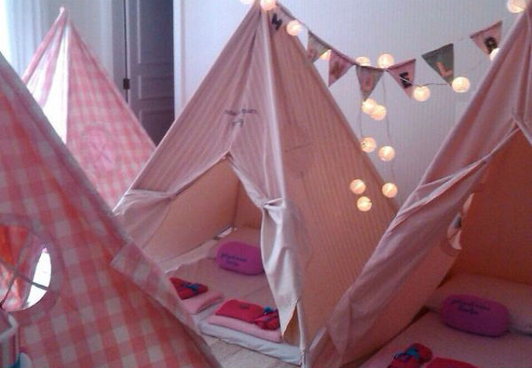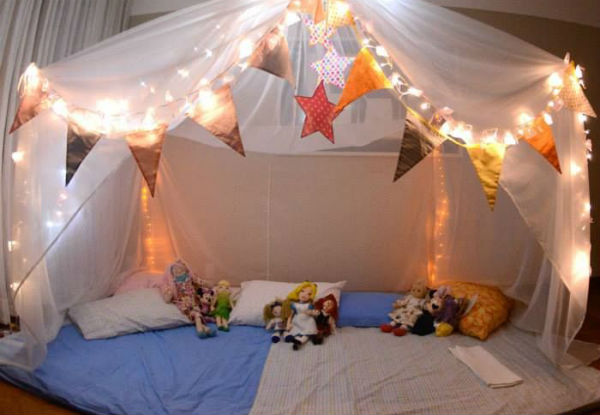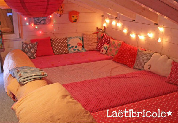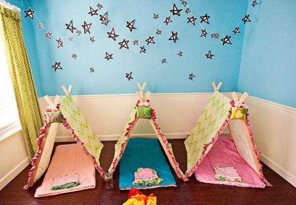 Independente do espaço que você tem em casa, o importante é montar um cantinho aconchegante para as pequenas dormirem. Se você é boa em costura, vale confeccionar cabaninhas de tecido. Se o orçamento não permitir, coloque colchões no chão com almofadas bem coloridas. Elas vão adorar!