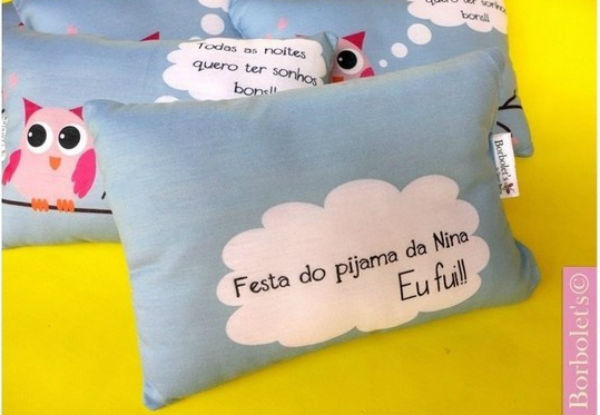 Na festa do pijama, as lembrancinhas devem ser entregues para as convidadas durante a comemoração. Inspire-se nessas ideias: almofadas personalizadas, chinelos de pano coloridos, máscaras para dormir, kit higiene com escova de dentes e toalhinha. Tenho certeza de que será sucesso absoluto entre as pequenas!