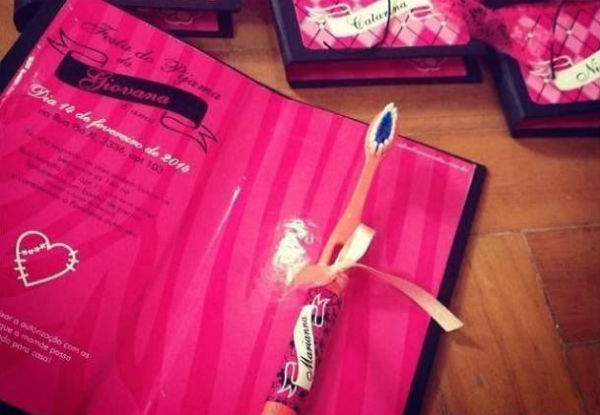 Dois modelos interessantes: uma máscara de dormir feita com scrapbook e um convite que contém escova de dentes para a amiga levar no grande dia!