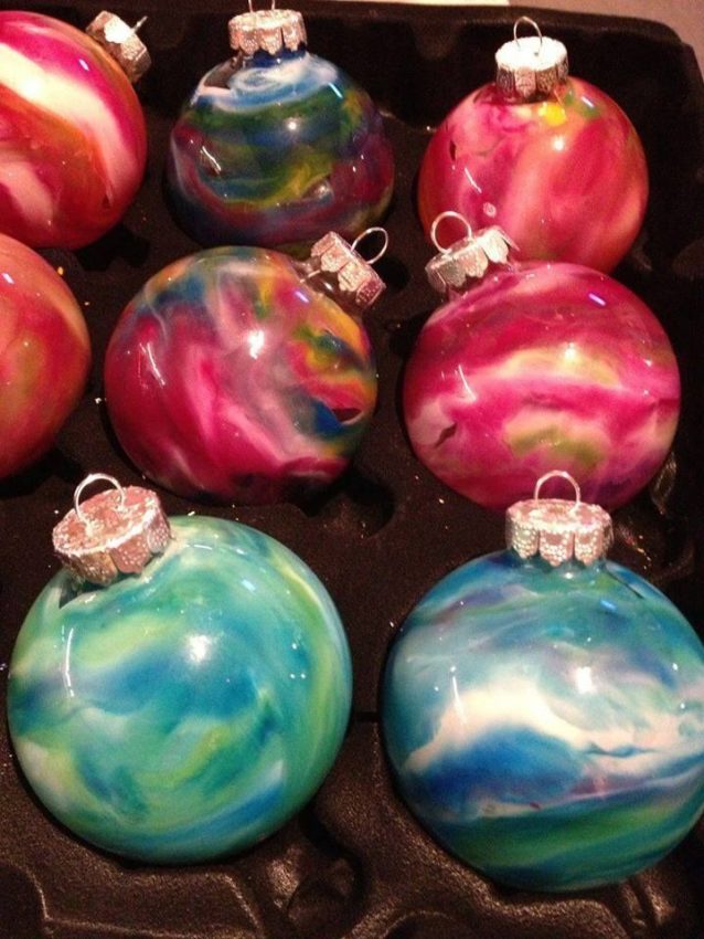 A primeira delas é para quem ainda não está satisfeito com a árvore de Natal. Dá tempo de fazer bolas super criativas junto com as crianças, usando secador e giz de cera (eu já mostrei nesse post aqui que dá para derreter o giz com o calor do equipamento). É importante que você use um giz de cera bem molinho, para conseguir derretê-lo com o secador e cobrir as bolas. Como a composição do giz pode variar, a temperatura de fusão também poderá ser maior ou menor (por isso teste antes para saber se ele derrete). Até onde eu pesquisei, o giz da Crayola funciona bem para a execução da ideia. O passo-a-passo você encontra no site da Living, Loving Laughing.