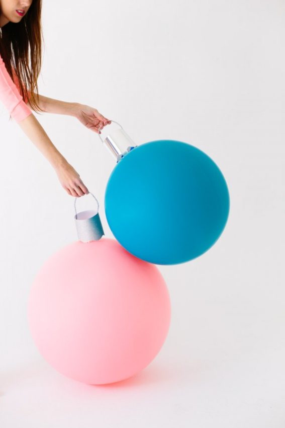 A terceira ideia é fazer bolas de Natal gigantes! Já imaginou a diversão das crianças durante a festa, com um brinquedo desses? Em lojas especializadas de balões você encontra tamanhos bem maiores do que os usuais (os da foto têm 36 polegadas), usados em festinhas infantis. Aí é só fazer o “cabinho” da bola em papel metalizado. Inspiração retirada do site do Studio DIY.