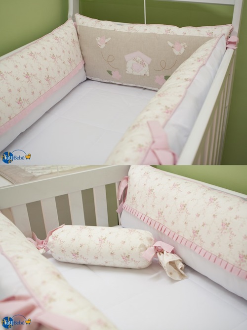 Para mostrar no post, escolhi cinco ideias irresistíveis para essa decoração temática. Em primeiro lugar, um kit berço em rosa, bege e branco (amei a casa de passarinho da cabeceira! E o tecido floral delicado usado em toda a extensão dos protetores), em 100% algodão, bordado à mão e detalhes de piquet. Interessante que você pode pedir com rolinho, saia do berço e trocador combinando.
