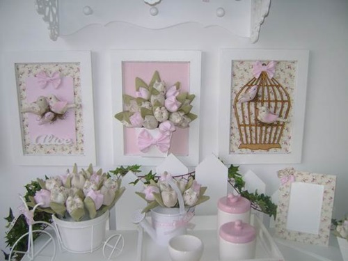 Gostei bastante de um kit higiene romântico, que vem com dois potes de cerâmica, uma cumbuca para dispensar a água e um regadorzinho decorativo com tulipas de tecido. É possível encomendar também com o mesmo fabricante o porta-retratos e os quadrinhos de parede com passarinhos. Uma graça!