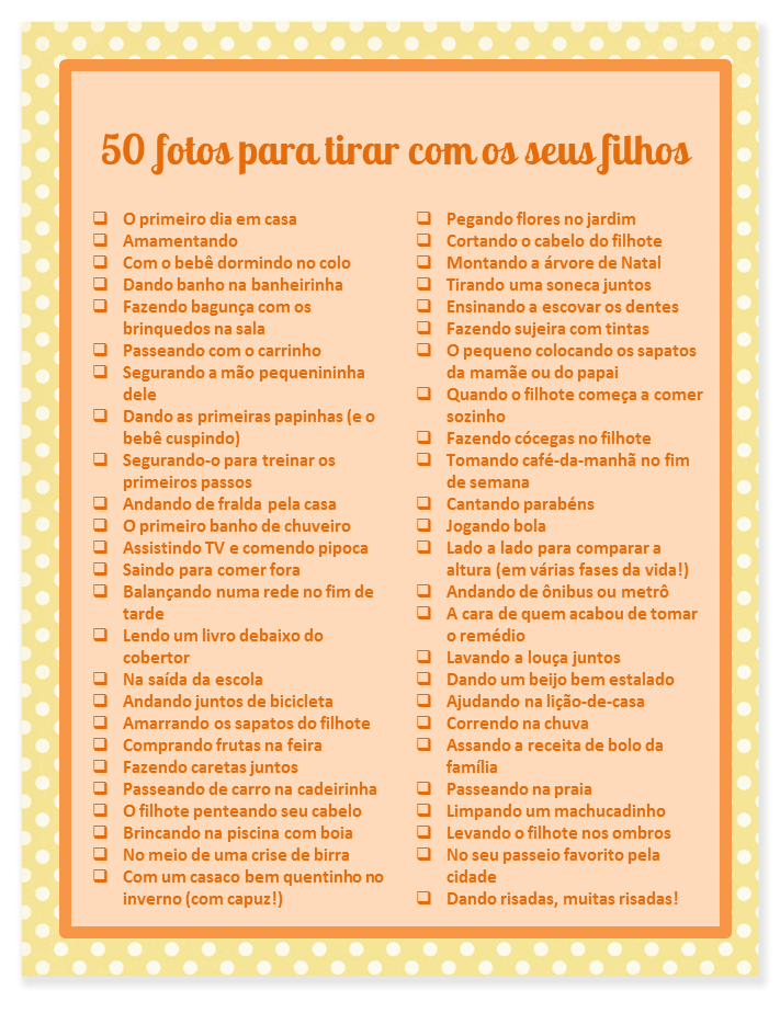 Então como não posso ver um lápis e um papel, ou melhor, um computador e um teclado, acabei por fazer uma lista com as 50 fotos que quero tirar com Catarina antes que ela cresça. Algumas delas eu já tirei, outras vou colocar minha atenção para não deixar o momento passar em branco. E como não poderia deixar de ser, compartilho com vocês a lista aqui. Sintam-se à vontade para usá-la como inspiração e para completá-la com as fotos que você não quer deixar de tirar do seu filhote!
