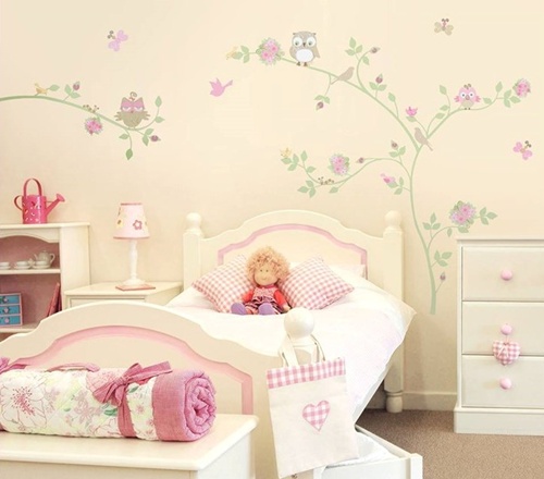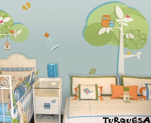 Adesivos de parede: as árvores ganham lindas corujinhas para alegrar o ambiente. As vantagens são a praticidade ao instalar e o bom custo-benefício (apenas com um adesivo você já decora toda a parede). Da Primeiro Quarto.