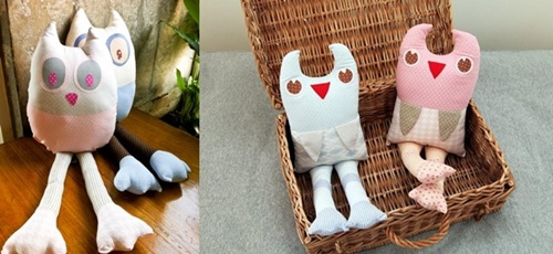 Kits de higiene: com corujas azuis em feltro, da Nickmania. E na cor rosa, da Infinita Arte.