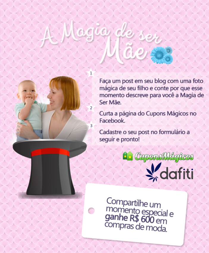 “Estou participando da Promoção “Magia de Ser Mãe” do Cupons Mágicos e Dafiti. Saiba mais na fan page do Cupons Mágicos para ganhar R$ 600 reais em compras!”.