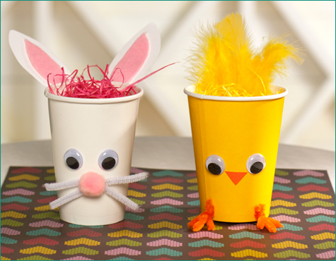 Fácil, fácil! Corte na cartolina branca duas orelhinhas de coelho. Recorte na cartolina rosa os detalhes da orelha e cole na cartolina branca. Cole ou grampeie as orelhas no copo de papel descartável. Cole os olhos (que podem ser em plástico ou feitos com cartolina preta) no copo. Corte pedaços de tecido (ou aproveite o cadarço velho de um tênis) para fazer o bigode. Cole no copo, fazendo o acabamento com o algodão-bolinha rosa no lugar do focinho. Na parte de trás do copo, cole algodão branco para fazer o pompom do rabinho. Encha com papel de seda rosa picadinho e o que mais desejar!
