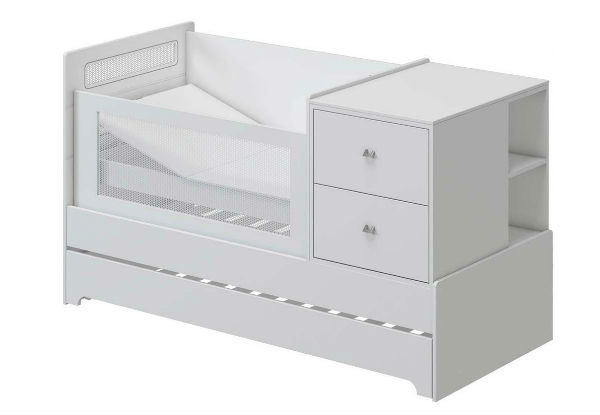 No berço multifuncional, a montagem inicial normalmente é feita de modo que o trocador fica ao lado do berço, e há uma cama auxiliar embaixo (muito útil para os primeiros anos do bebê, principalmente quando o pequeno fica doente e você precisa passar a noite ao seu lado). Com o crescimento da criança, você pode deixá-la dormindo em uma cama de solteiro grande (a antiga auxiliar), enquanto o trocador e os gaveteiros viram a escrivaninha e o criado-mudo. Veja alguns exemplos: