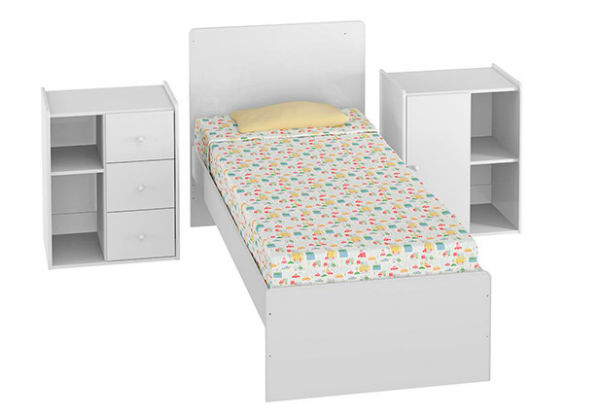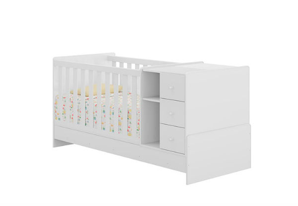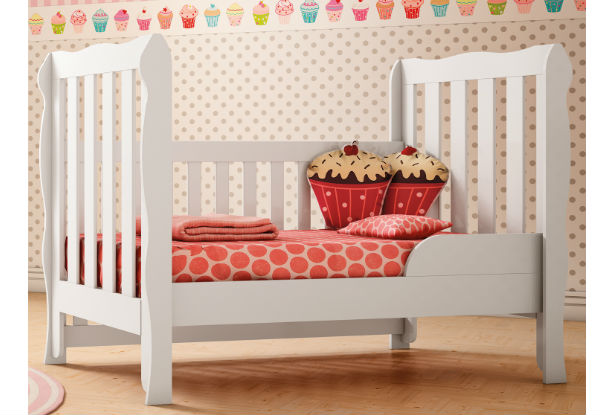 Eu não sabia, mas pesquisando para fazer esse post, descobri que existe um modelo intermediário, sem trocador, que não vira escrivaninha e não tem cama auxiliar, mas que se transforma em uma mini-cama um pouco maior do que o berço (além disso, a cabeceira permanece alta, mas os pés ficam baixos). Há um módulo que inicialmente pode ser usado para roupinhas e outros objetos do bebê, e que depois pode virar um criado-mudo, ou nicho para parede.