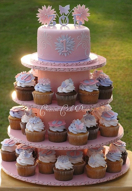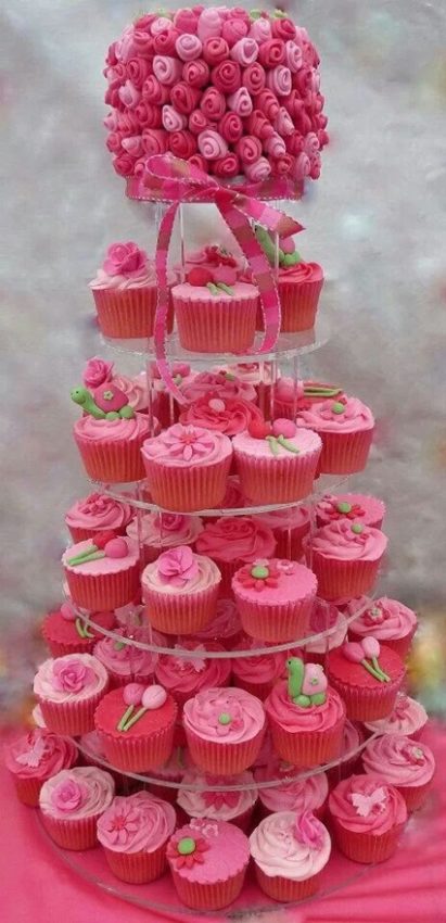 O bolo de cupcake também é uma saída bem interessante para ser usado como bolo de batizado ou de chá de bebê. Nessas ocasiões não há um parabéns, mas os convidados esperam por um “bolinho” para comemorar o evento. A montagem mais charmosa é feita em forma de torre, em que os cupcakes são dispostos em várias camadas para dar o efeito visual de um bolo (no topo, pode de fato haver um bolo pequenininho, em geral com pasta americana – mas que pode ser substituído por um cenográfico).