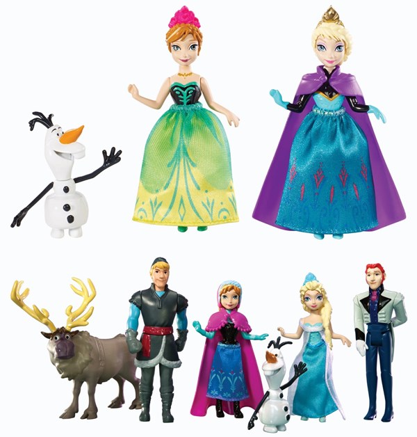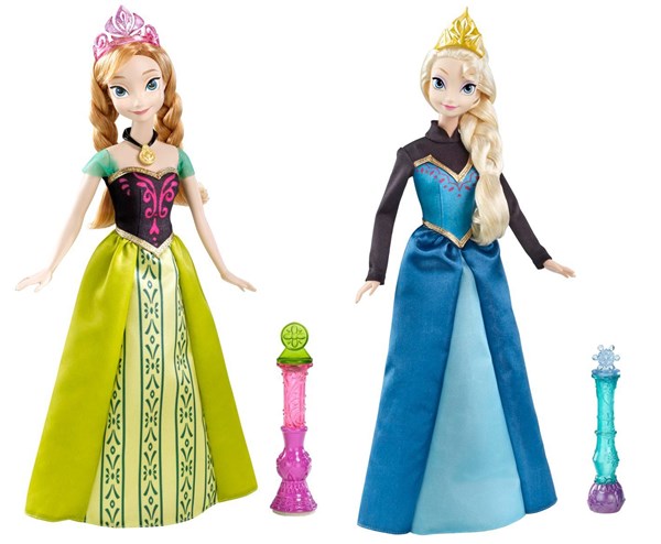 Bonecas Anna e Elsa color change: vêm com uma varinha mágica que muda os detalhes do vestido (usando água para isso). Assim como as outras já citadas, são vendidas separadamente.