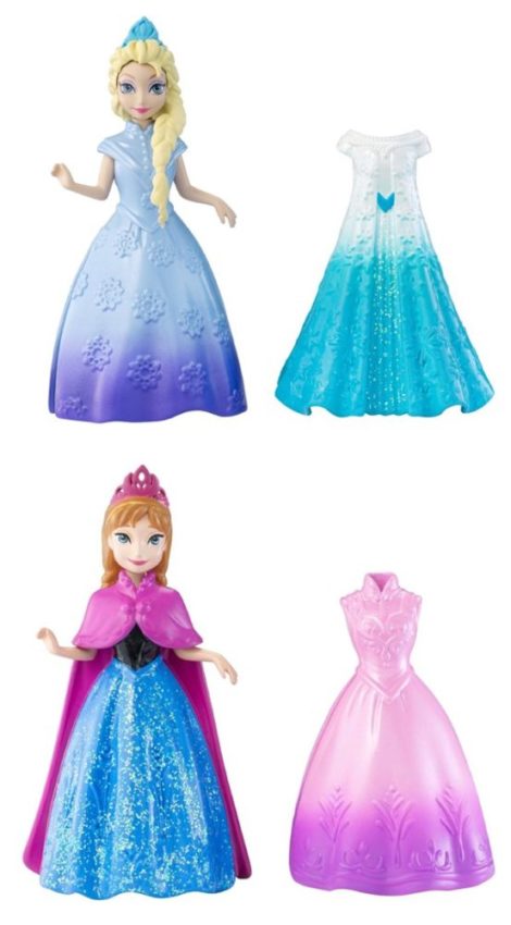 Bonecas Elsa e Anna Magic Clip: são as pequenas, fáceis de manusear, como eu comentei anteriormente. Há várias princesinhas com os vestidos Magic Clip, mas achei essas as mais legais (porque já vêm com uma troca de roupa). Também vendidas separadamente.
