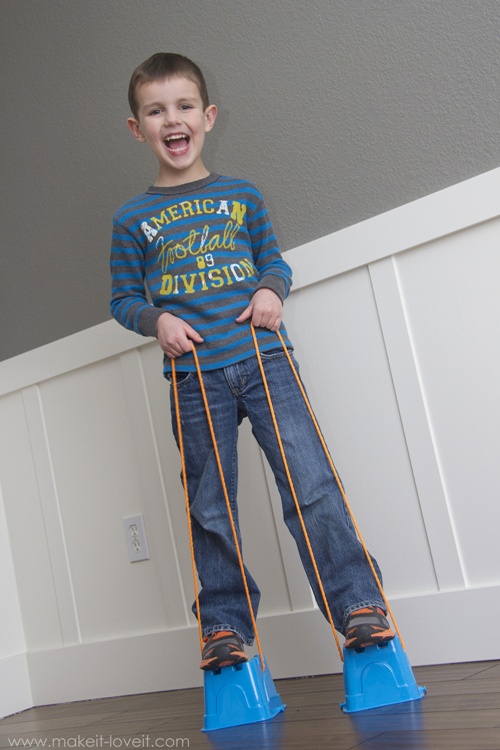 Pernas de pau: quando criança, eu adorava essa brincadeira, pois me dava a sensação de que estava muito alta, mesmo estando a poucos centímetros do chão. Vale fazer com baldinhos de praia (como os da foto) ou até mesmo com latinhas. Veja o passo a passo nesse site (também em inglês).