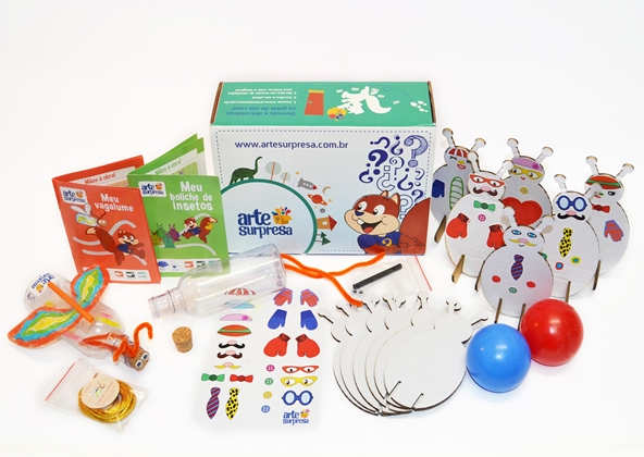 Caixa Mundo dos Insetos: permite que a criança monte seu próprio boliche de insetos! E um vaga-lume que brilha no escuro e que voa pelo quarto!