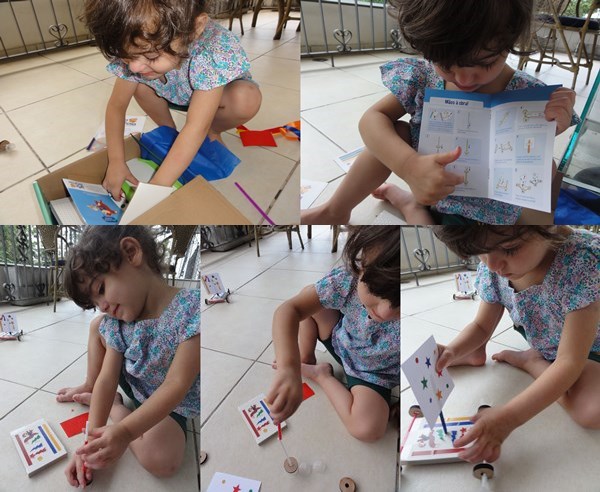 Agora contando como foi a chegada da caixa aqui em casa: primeiro Catarina ficou louca para saber o que havia dentro. Ao abrirmos a caixa, ela se interessou por cada item do que havia lá dentro e ficou me perguntando o que faríamos com tudo aquilo (momento de exploração!). Quando começamos a executar o projeto juntas, ela conseguiu ajudar em cada etapa (as instruções são simples, diretas e fáceis de acompanhar). E quando o brinquedo ficou pronto, ela quis mostrar para todo mundo que tinha ajudado a fazer!