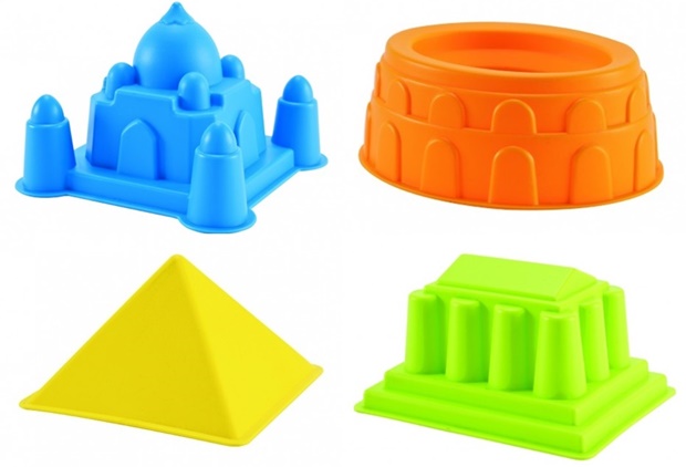 – Formas para areia no formato de grandes monumentos do mundo: para o pequeno construir o Coliseu, o Taj Mahal, o Parthenon de Atenas e as Pirâmides do Egito na areia! Aproveite e conte para ele sobre os países do mundo e eventualmente alguma viagem que você já tenha feito para esses lugares!