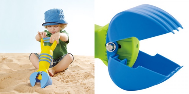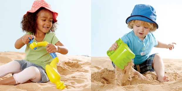 Eu procurei bastante por aí, mas os brinquedos de praia mais bacanas que eu encontrei aqui no Brasil foram os de uma marca chamada Hape Toys. Eu não os conhecia, até que os descobri pela loja do Mundo Ovo. O interessante é que eles conseguiram transformar a brincadeira na areia em algo super criativo – e com elementos que podem até mesmo estimular a busca pela cultura no filhote.