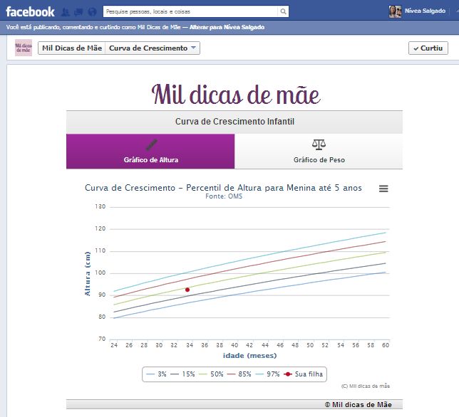 E já que nós mães sempre damos uma passadinha no Facebook, resolvemos colocar a calculadora lá também. Se você gostar, mande para aquela sua amiga que está com um bebezinho recém-nascido, e que está receosa com o ganho de peso e de altura do bebê. Dessa forma ela poderá acompanhar o crescimento do seu bebê de pertinho! E isso sem complicação, com poucos cliques!