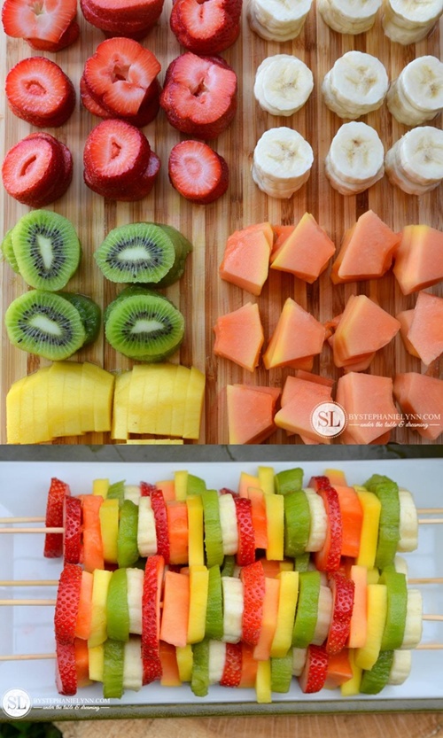 Uma dica interessante para as festas no verão é utilizar bandejas com “gelinhos plásticos” (ao invés de colocar a pedra de gelo, que derreterá, você pode usar esses geladinhos – procure na internet ou em lojas de produtos para casa, pois você os encontrará em diferentes cores e formatos). Essa é uma excelente forma de manter copinhos de mousse ou doces mais delicados sem derreter. Abuse também das frutas, que ajudam a hidratar a criançada: picadinhas em taças, palitos ou em espetinhos.