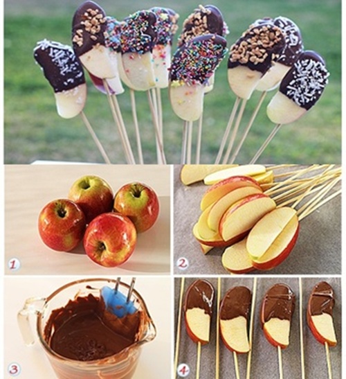 Palitos de frutas: recobertos de chocolate ou não, são sucesso garantido.