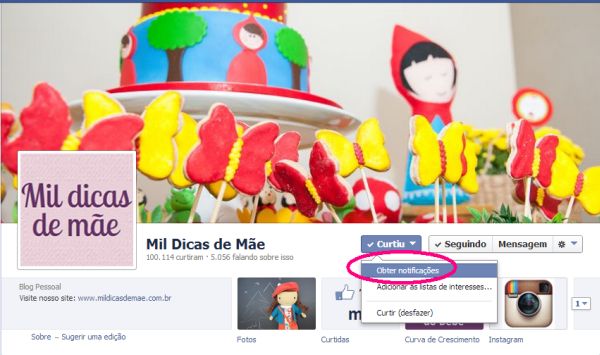 – Passe o mouse em cima do botão Curtir da página e clique na opção Obter notificações
