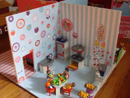 Uma casinha bem fácil de fazer, com três partes de isopor – ou placas de madeira (duas que se encaixam para fazer as paredes, uma para a base). Depois é só pintar e colocar os móveis! As instruções (em inglês) de como fazer estão aqui.
