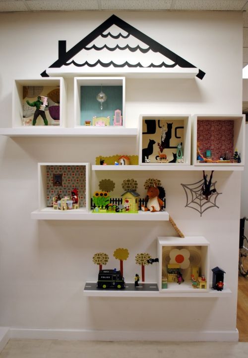 Olha só: dá para fazer com prateleiras fixas na parede! Eu adorei a prateleira mais baixa, com a fita adesiva que simula uma rua que chega até a casa! Ah, e a escadinha entre uma prateleira e outra, claro!