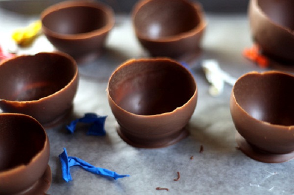 – Mergulhe a parte arredondada da bexiga no chocolate e a prenda de pé no círculo de chocolate.