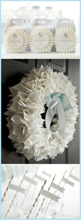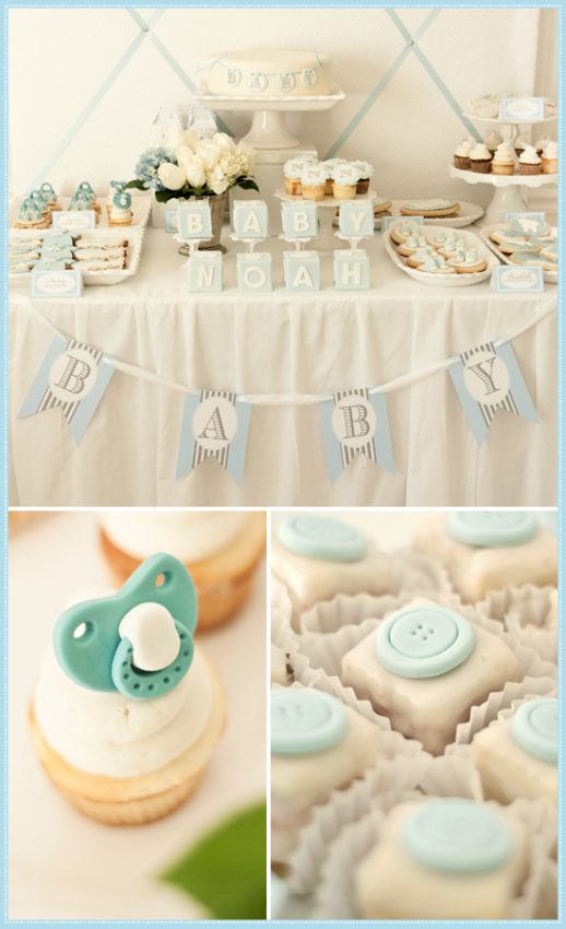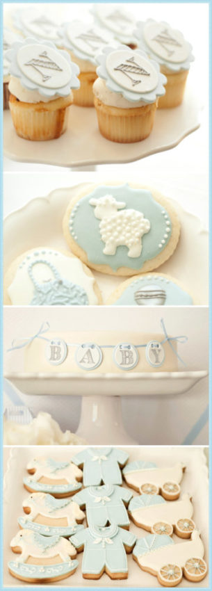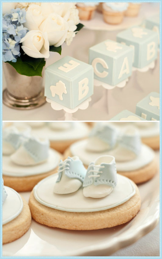 Quem disse que não dá para fazer um chá de bebê para meninos bem delicado? Essa decoração que mostro hoje prova exatamente isso: cada detalhe pensado pela futura mamãe é puro romantismo! A inspiração foi inusitada: a bolsa que a mãe usará para carregar as coisas do filhote (nunca vi uma bolsa de passeio de bebê tão chiquérrima como essa!) – e que também foi usada na decoração da festa. Repare em cada biscoito (com detalhes de carrinhos de bebê, de cavalinho, de ovelhinha, de roupinha de bebê), nos cupcakes (com mamadeiras, com chupetas, com as iniciais do bebê), nos macarrons, no bolo (super clean). Enfim, tudo de muito bom gosto, para você se inspirar e organizar um chá de bebê inesquecível!
