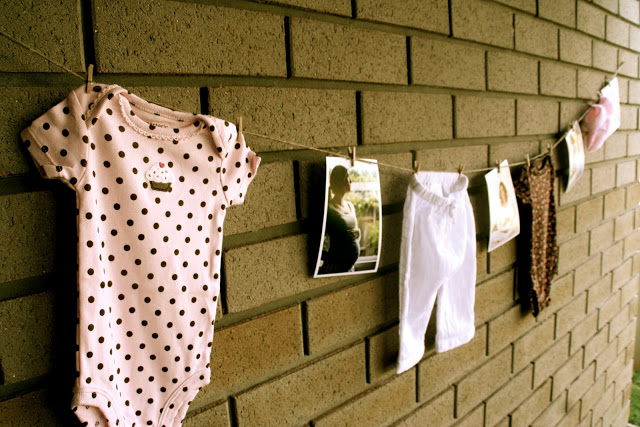 Para começar, um varalzinho com roupinhas do bebê e uma foto da futura mamãe com o barrigão