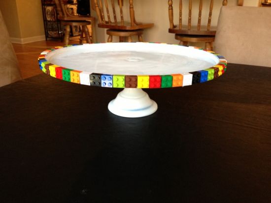 Prato de bolo decorado com as peças, coladas com cola quente.