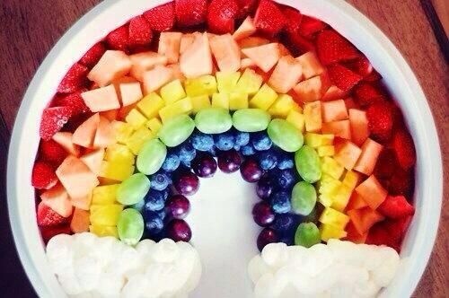 A natureza não é bela? Apenas com frutas é possível montar um lindo arco-íris! Você pode fazer um grande como esse para decorar a mesa ou picar as frutas e distribuir em tacinhas transparentes!
