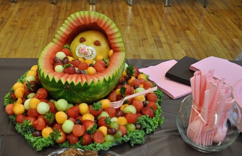 Independente da forma de bebezinho (que poderia ser bacana para um chá de bebê), o interessante é deixar garfinhos próximos às frutas, para que os convidados se sirvam facilmente.