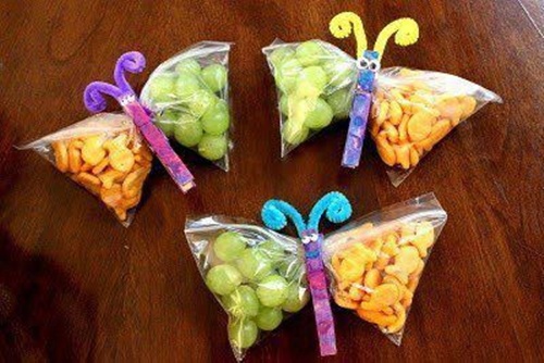 Essas borboletinhas feitas com saquinhos e prendedores de madeira são super práticas! Eu não colocaria salgadinhos (como esses de peixinho), e sim recortaria algum bichinho de fruta, usando cortadores de biscoito.