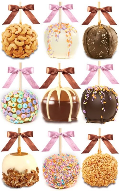 Eu adoro maçã, mas nunca gostei da maçã do amor convencional (aquela vermelha de casquinha dura, cheia de corante!). Essas aqui são muito comuns no exterior (são maçãs verdes recobertas com caramelo e enfeitadas com diversos tipos de guloseimas: granulado, nozes, amendoim ou amêndoas picadas). Quem já provou garante que é uma delícia!