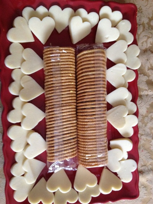 Muito meigos esses corações de queijo! Até dispensam as bolachinhas de água e sal, se você preferir. Para facilitar, use cortadores de biscoito na confecção).