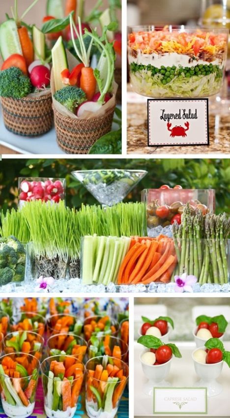 Uma mesa como essa não é de encher os olhos? E não é difícil preparar legumes em palitos, que serão distribuídos em copinhos de plástico transparentes. Tomatinhos cereja e bolinhas de mussarela de búfala também são uma delícia! Com tanto verde, dá para pensar em decorar uma festa com tema jardim encantado de uma forma muito original!