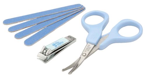 Depois de um tempo, naturalmente, a unha do bebê ficará mais grossa, e apenas uma lixa não será o suficiente para apará-la. Há no mercado kits de manicure para bebês (como o da imagem abaixo), com uma tesoura sem ponta e um mini-cortador (que muitos conhecem como Trim). Eu praticamente não usei a tesoura, acho mil vezes mais fácil usar o cortador. Corte as unhas retas, sem aprofundar muito nos cantos para que não haja risco da unha encravar e inflamar o dedo do filhote. Não custa lembrar: tesouras, cortadores e lixas que forem usadas no bebê são apenas dele e não devem ser compartilhadas pelo resto da família.