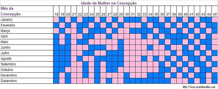 Tabela chinesa: sem comprovação científica (e no meu caso não consigo nem dizer se deu certo, pois posso ter engravidado ao fim de um mês ou início do outro, o que mudaria completamente a previsão), mas bem divertida. A maioria das mães que conheço disse que a tabela acertou, então no mínimo vale a espiadinha. Para usá-la, você deve somar 1 à sua idade no dia da concepção (exemplo: se você tinha 32 anos, some a eles 1 e veja na tabela a previsão usando como base 33 anos). A exceção fica por conta de quem nasceu em janeiro ou fevereiro: nesse caso use a sua idade sem nenhuma soma.
