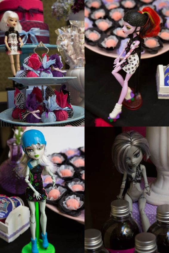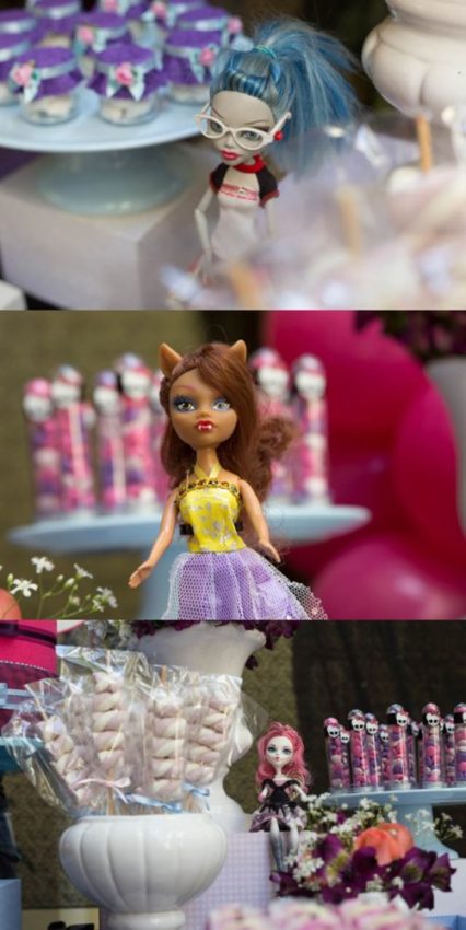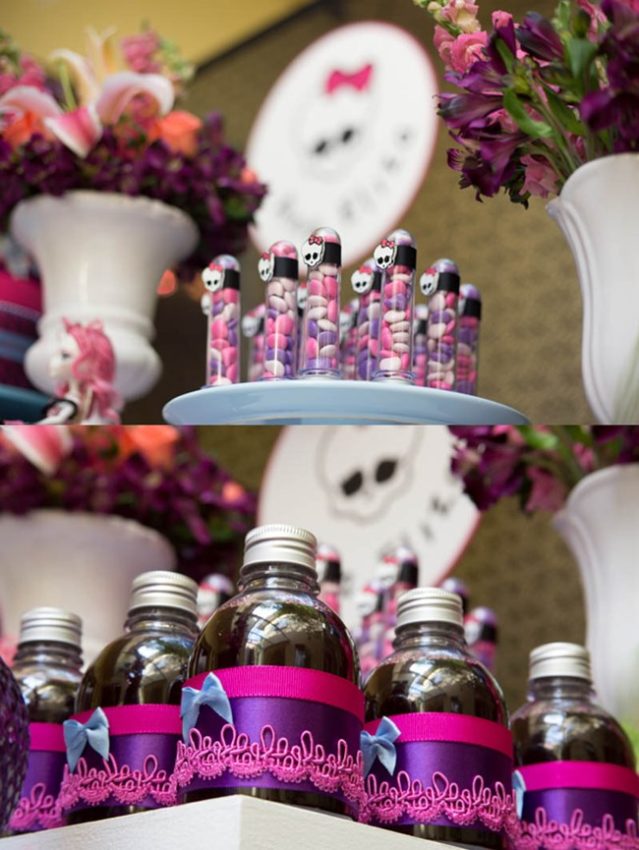 Um das ideias de doces de que eu gosto bastante são os marshmallows montados em palitos e fechados em saquinhos (sou apaixonada por esses “molinhos”, então minha opinião não é muito imparcial nesse caso!). Outro ponto que eu achei bem interessante nessa decoração de festa Monster High foram as garrafinhas decoradas com quatro tipos diferentes de fitas (uma mais grossa roxa, uma mais fina pink, uma cor-de-rosa mais clara cheia de voltinhas e um pequeno lacinho azul). Com certeza podem servir de inspiração para muitas leitoras!