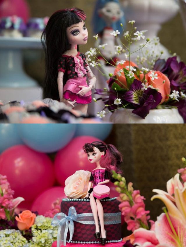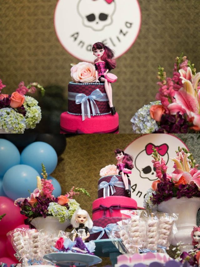 Essa decoração de festa Monster High foi feita em tons vibrantes de rosa (pink) e azul, com toques de lilás. A mesa foi montada simetricamente, ou seja, tudo o que você vê em uma metade, também encontrará do lado oposto. Os arranjos florais ficaram lindos, com rosas, boca-de-leão, lírios e hortênsias. As três camadas do bolo são cenográficas e encapadas com tecido (fica um charme e tem um custo muito menor do que um bolo real de tantos andares!). Uma rosa e uma das Monster High no topo foram o suficiente para dar um charme todo especial.