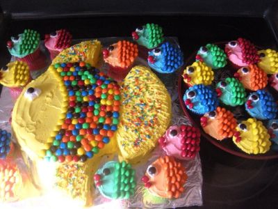 Outra inspiração do mar: bolo e cupcakes de peixes (adorei a ideia de usar os confeitos como escamas!)