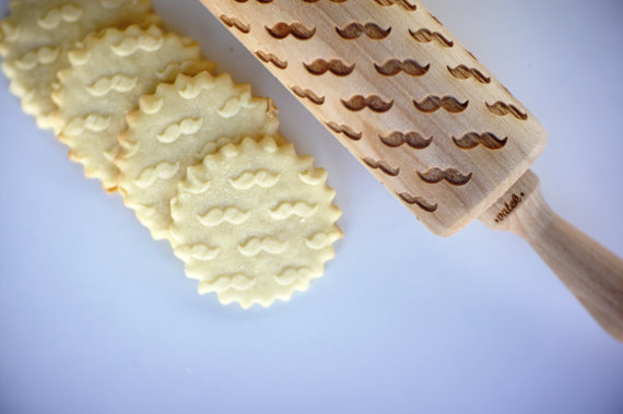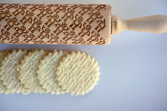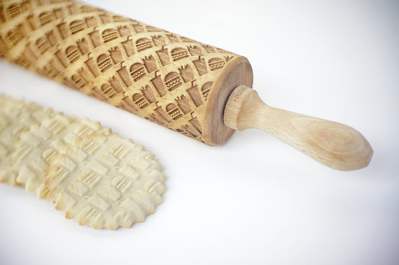 O rolo é gravado à laser com figuras super simpáticas. Dinossauros, robôs, sanduíches, gatos, cachorros… Você passa o rolo sobre a massa com que está trabalhando para gravar ali os desenhos. Há padrões já prontos, mas você pode encomendar um personalizado. O preço não é dos mais baratos: o rolo padrão custa por volta de R$94,00; o personalizado, de R$125,00 (com seu nome) a R$305,00 (com qualquer outro desenho que você escolher). E ainda são mais R$37,00 de frete para o Brasil.