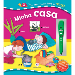 Agora falando um pouco mais sobre o livro: além das figuras, identificadas com palavras em português e sua correspondente em inglês, há uma espécie de caneta eletrônica, que toca e acende uma luz verde quando a pergunta do livro é corretamente respondida. Por exemplo, na página da sala de estar, o leitor é convidado a identificar as figuras que são móveis. Se a caneta for colocada sobre o desenho da mesa, da cadeira, da estante, acende em verde. Mas se for colocada sobre o rádio ou o espelho, aparecerá a luz vermelha. Conclusão: a criançada adora a interação, e passa um bom tempo brincando com a caneta.
