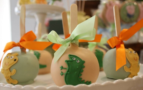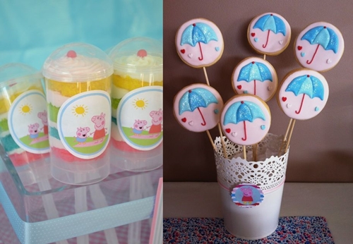Amei a ideia de cupcakes com nuvens, sóis, graminha verde e com a própria personagem – tudo com cara de festa de criança, exatamente do jeito que gosto! Os biscoitos que levam Peppa e George carregando balões também estão lindos! Outros doces bacanas são o push cake (aquele tipo de bolinho que é colocado dentro de um plástico e que pode ser empurrado para cima – assim fica protegido até a hora da criança comê-lo) e as maçãs do amor com o ursinho Teddy de Peppa ou com o dinossauro de George. Tão fofas!