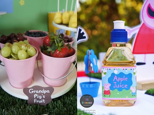 Para as mães que preferem um cardápio mais saudável, a sugestão são potes de frutas com uma plaquinha, sugerindo que vieram diretamente da horta do Vovô Pig. Aposto que a criançada vai querer provar os morangos!