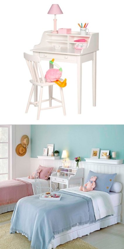 Outro dia, em uma loja de decoração, fiquei namorando uma mesinha, possivelmente a primeira “escrivaninha” que Catarina terá. Imaginei a filhotinha desenhando, pintando e lendo os livros de que tanto gosta. Que delícia! Procurando na internet achei muitos modelos interessantes, que eu mostro a seguir para vocês. Alguns são produzidos e comercializados no Brasil; outros são apenas inspirações para quem tem um bom marceneiro, ou um marido que gosta de colocar a mão na massa (meu pai era fantástico para essas coisas!). Sabia que dá até para aproveitar o antigo berço como escrivaninha para o quarto das crianças? Há um certo tempo publicamos a ideia em nossa fan page e fez muito sucesso!