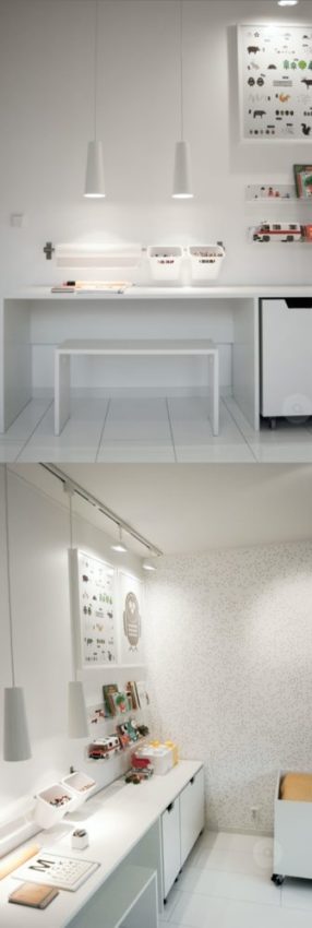 Prateleiras: use prateleiras múltiplas para formar uma escrivaninha! Essas aqui, fixas a um trilho, são bem bacanas, pois podem ser adaptadas à altura da criança, conforme ela cresce.
